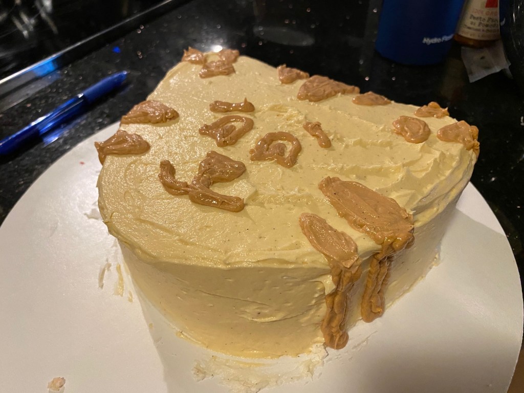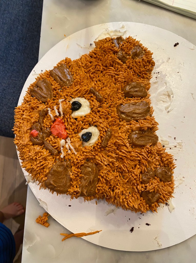 For his birthday this year, O requested a Daniel Tiger cake, which I quickly realized would be a lot harder than last year’s Elmo cake. I decide to do a few mini test cakes to find a design I liked and practice my piping. Neither O nor B seemed to mind the extra cake making, and B was even a good sport about the cleanup.